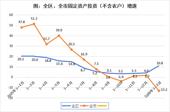 (四)基础设施投资负增长。1-2月份,全市基础设施投资同比下降46.3%,低于全部投资增速33.1个百分点,下拉全部投资增速37.5个百分点。从七个旗县区来看,除乌后旗同比增长78.6%外,临河区、五原县、磴口县、乌前旗、乌中旗和杭锦后旗分别下降1.9%、100.0%、78.2%、69.2%、100.0%和89.6%。