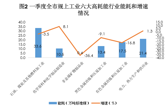 从高耗能行业看,高耗能行业用能和占比下降。一季度,全市规上工业六大高耗能行业能耗同比下降5.1%,拉动全市规上工业能耗下降3.6个百分点,占全市规上工业能耗比重为66.6%,同比下降3.0个百分点。其中,石油、煤炭及其他燃料加工业、非金属矿物制品业、黑色金属冶炼和压延加工业、有色金属冶炼和压延加工业分别同比下降3.5%、36.4%、9.1%、16.8%。